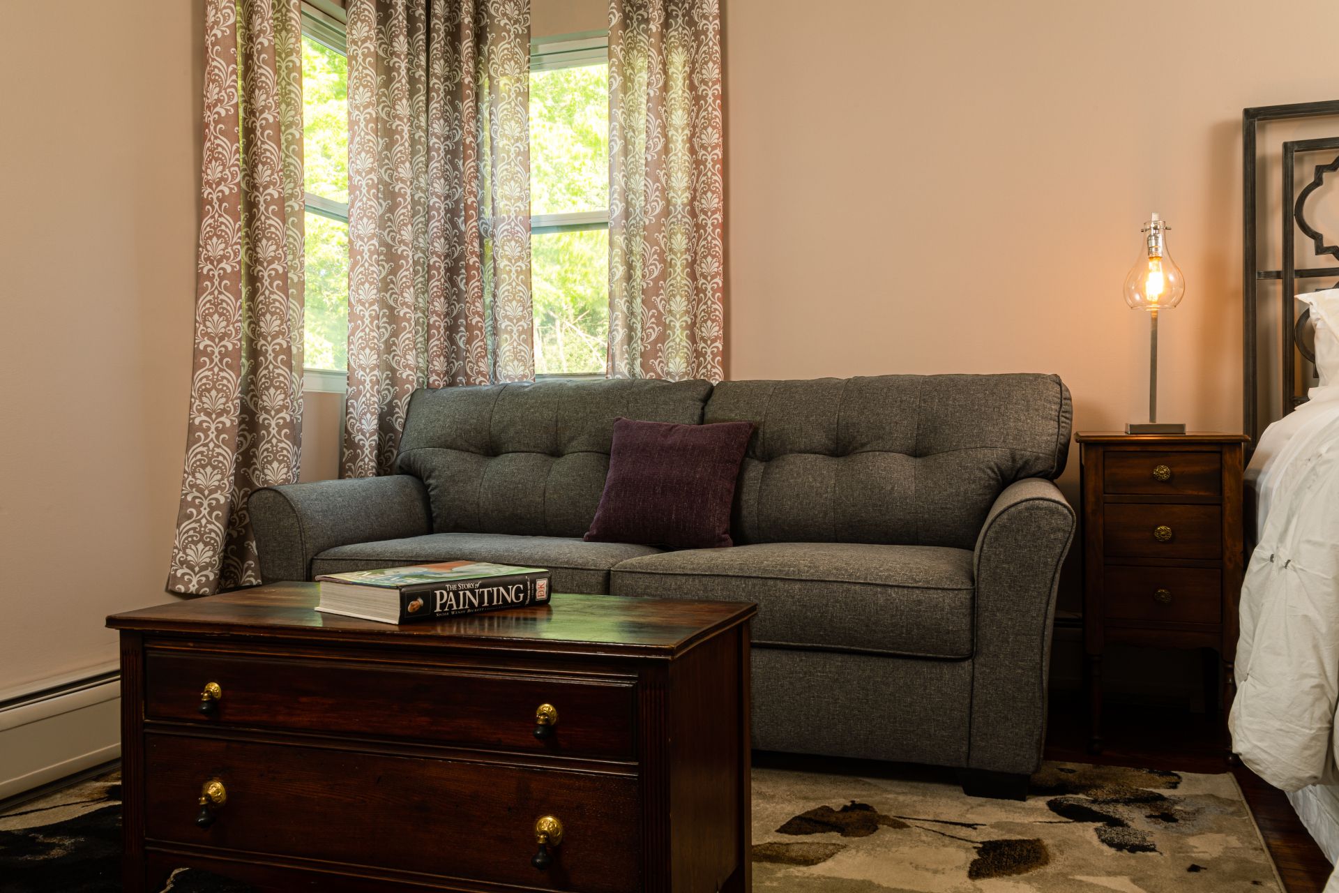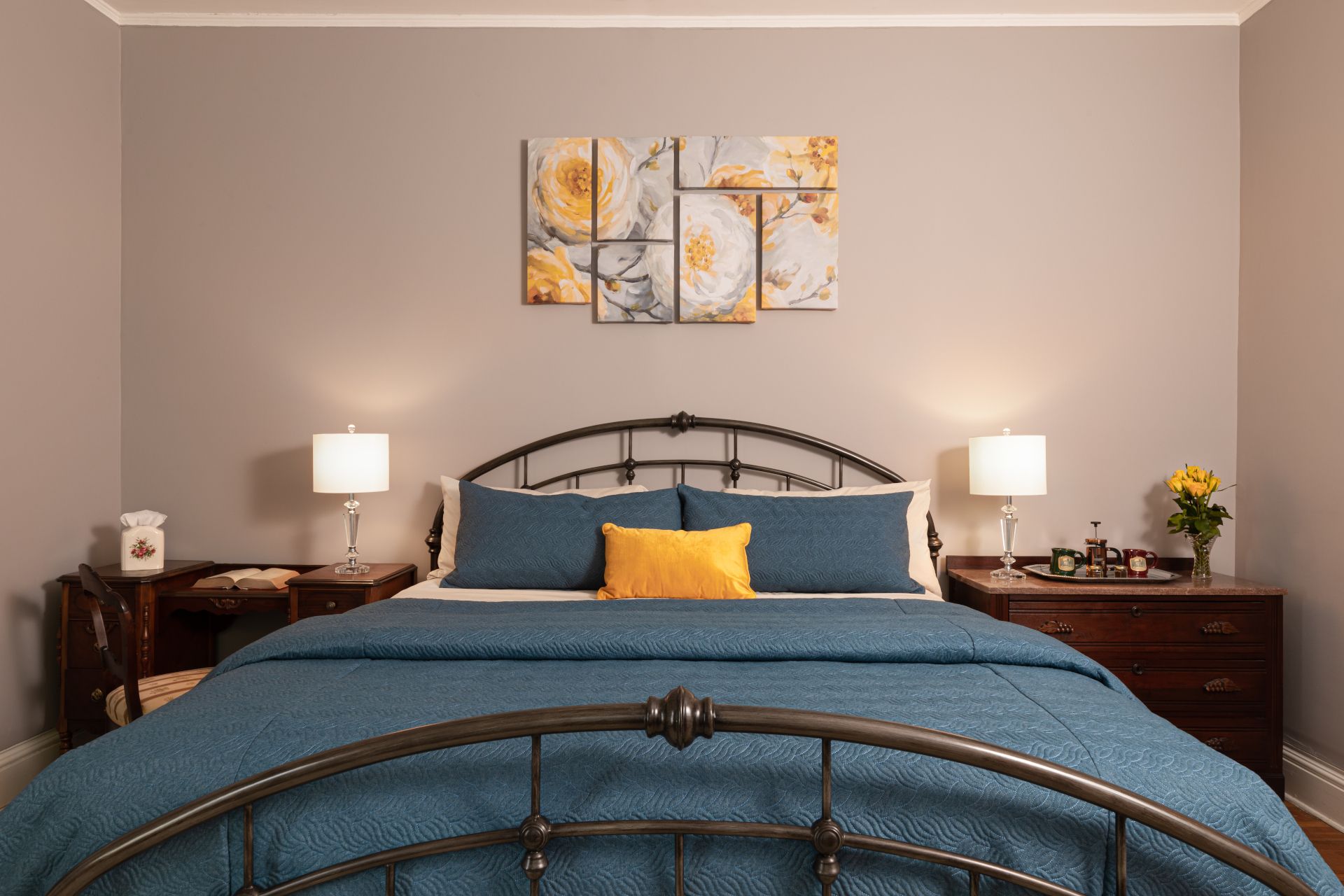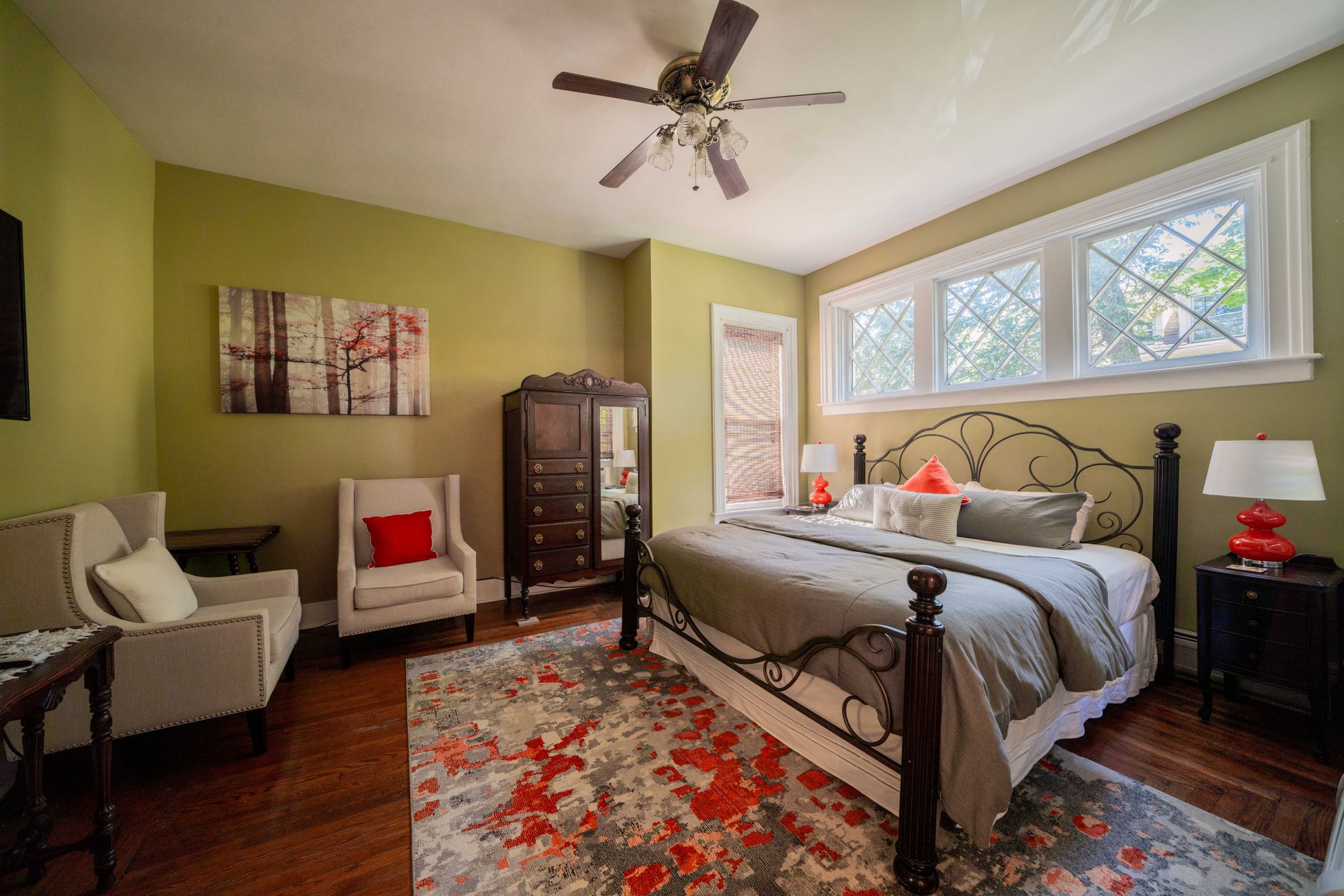 Lagerfeld peacefully sits at the back of the house overlooking the backyard. With a small desk and soothing color scheme, Lagerfeld provides a very comfortable working space for business travelers of all trades. After completing your work in Downtown Utica or the surrounding area, our historic bed and breakfast space will welcome you back in style.
