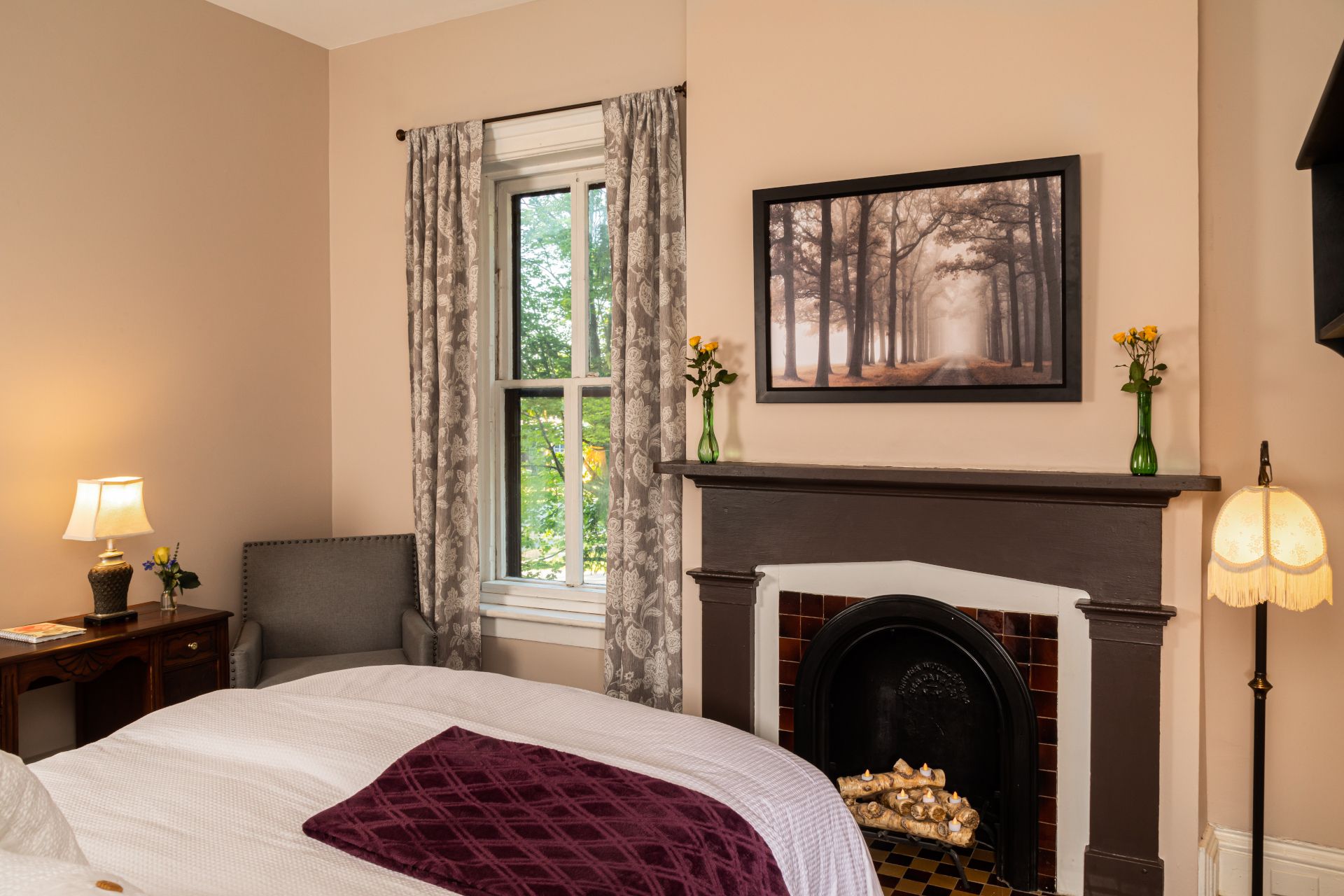 …is full of windows and bright light. Like the Chantilly room, Lavender is located at the front of the house and overlooks the front yard with century old trees bordering Genesee Street. Our only room that features an in-room electric fireplace, Lavender is both a comfortable and romantic space for you to enjoy. The perfect boutique hotel room to return to after you have enjoyed some quality time in Downtown Utica.