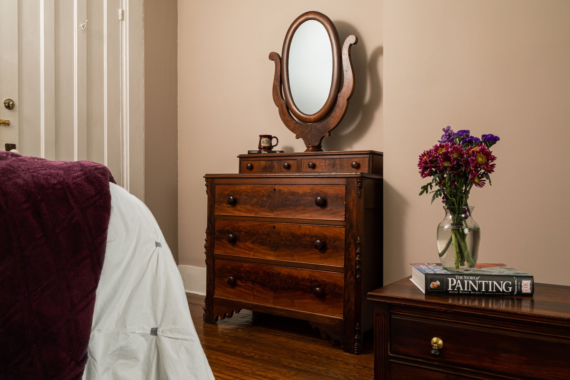Chantilly features the best of Victorian architecture and is perfect for your romantic getaway. It’s original white marble fireplace mantel and five bay window sitting area overlooking the front yard are only found in the Chantilly room. Eight foot tall windows throughout the room with original trim give open views of the surrounding city of Utica. A king sized bed and flat screen TV provide modern comfort in an historic environment.