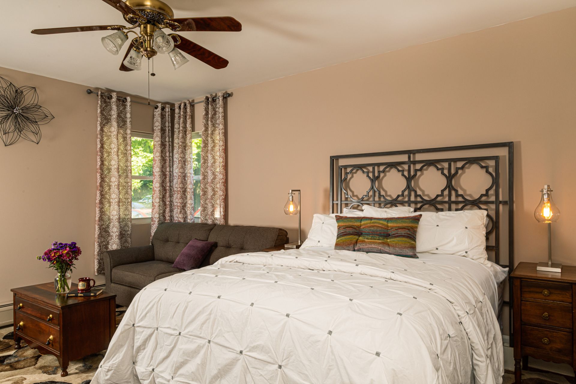 The largest, most spacious room at the Rosemont Inn and also the newest! With 13 foot ceilings and first floor location, New Dawn feels modern with touches of Victorian elegance throughout. King size bed with hybrid mattress is cozy and comfortable for your getaway to Utica, NY. Custom-tiled shower with console sink and large mirror add a luxurious touch compared to a standard Upstate NY hotel room. A pull-out couch provides an additional full-sized bed to accommodate up to 2 additional guests.