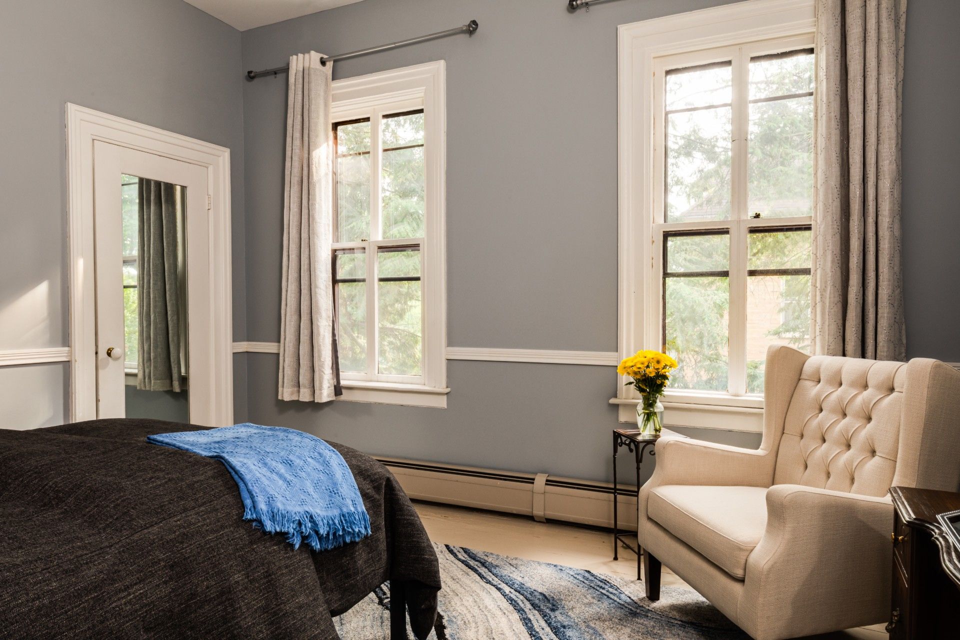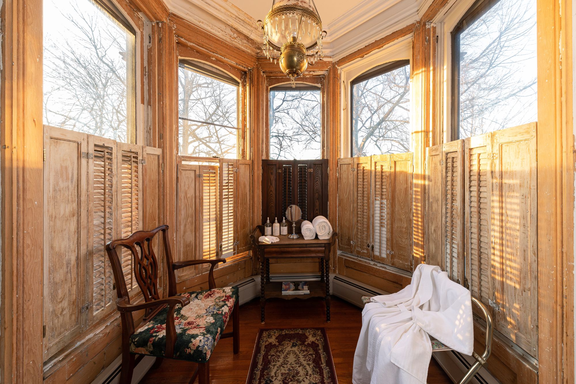 Located on the back hall of the house, Solitude is our most secluded room. Quiet and peaceful with 2 large windows looking out onto graceful pine trees, you will feel worlds away from all the cares of daily life.