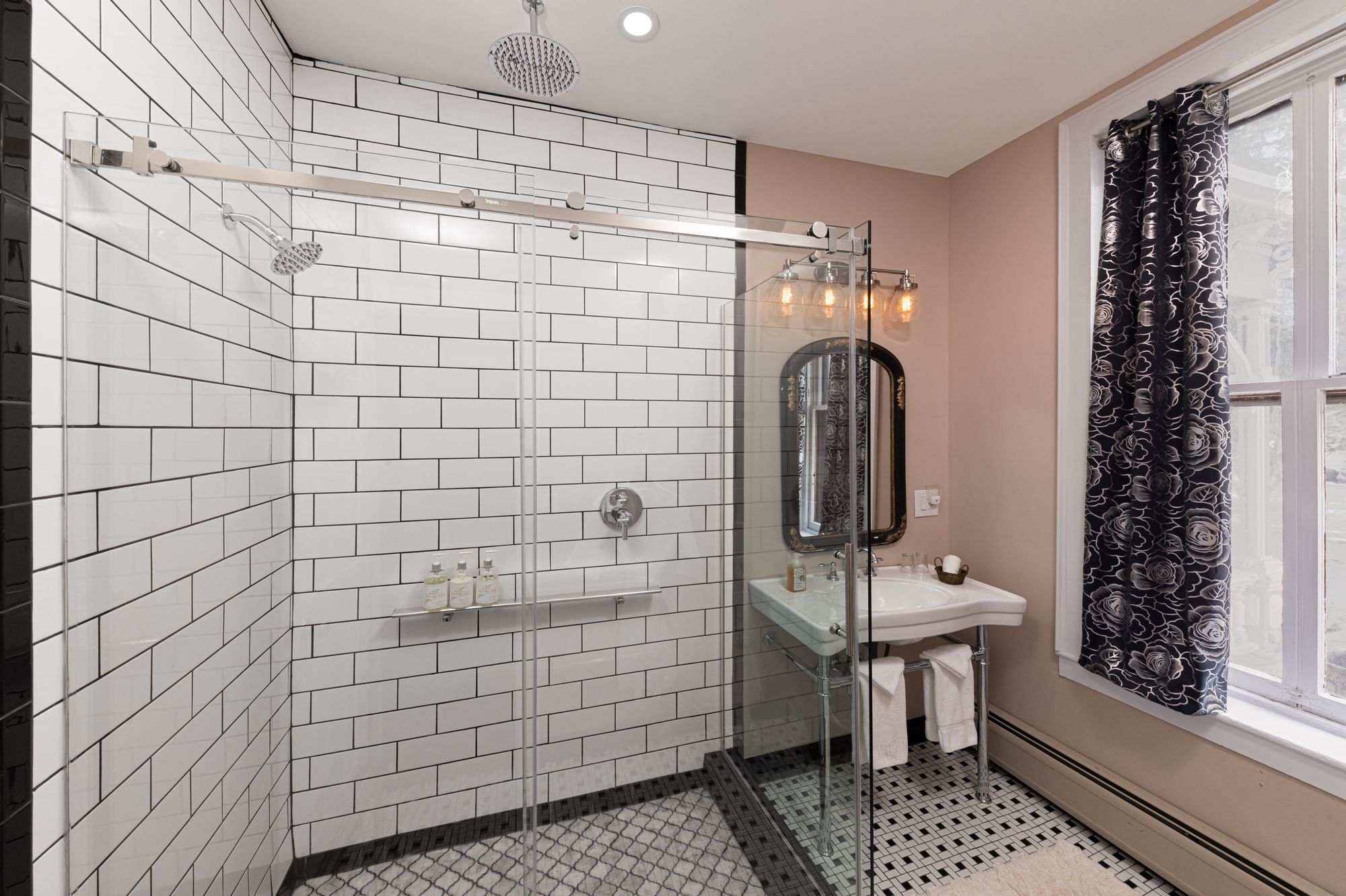 Victorian elements combine with modern luxury to make Othello a stand-out room. Large, luxurious and comfortable, three windows and 3 diamond accented windows above the bed add to the light, airy feeling. Spacious and elegant, this room features a King bed and large TV. An excellent choice for your romantic Upstate NY getaway. Best of all, a modern bathroom with custom-tiled 2-person shower, marble floors and a deep claw-foot soaking tub make this room feel spa-like.