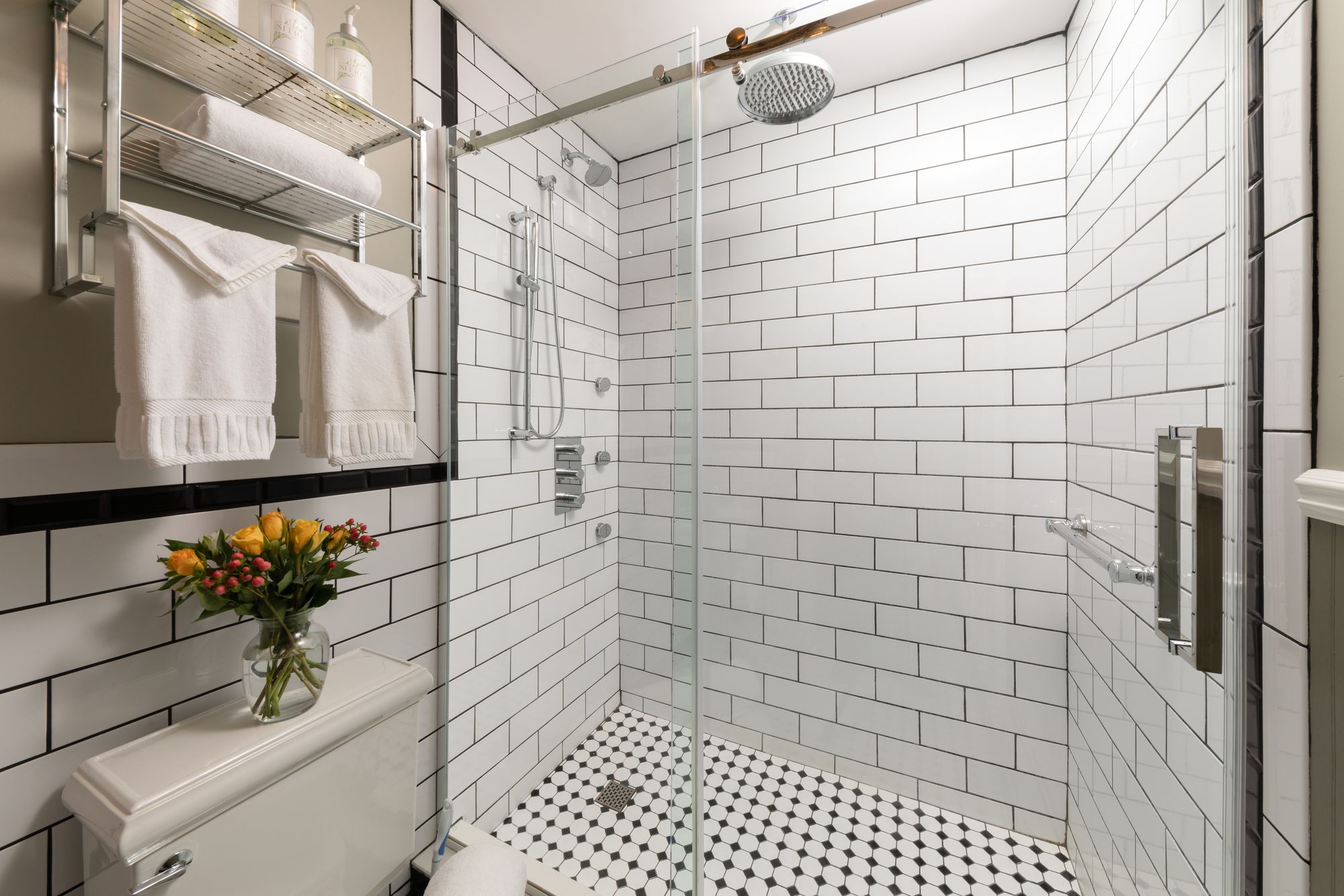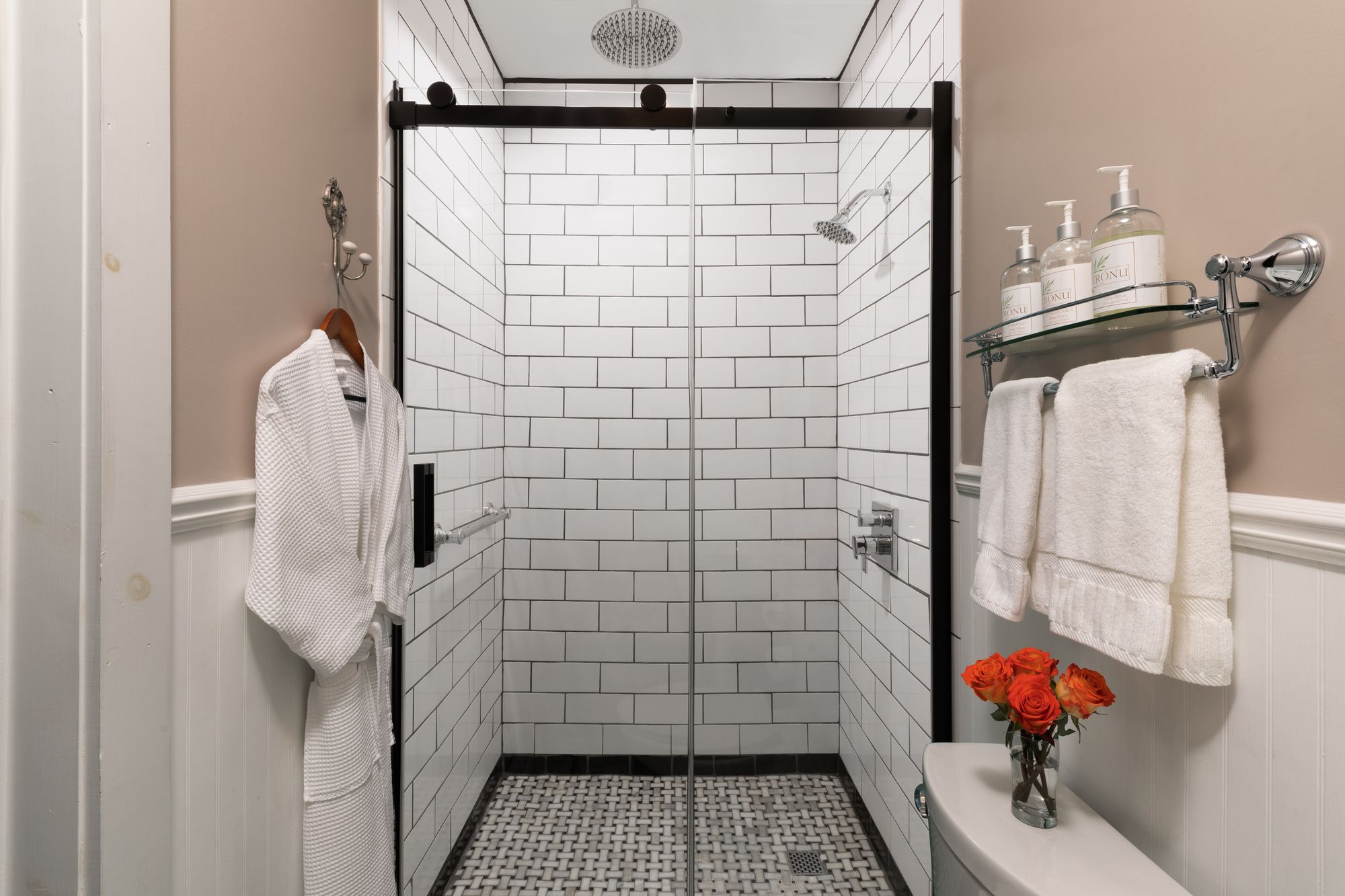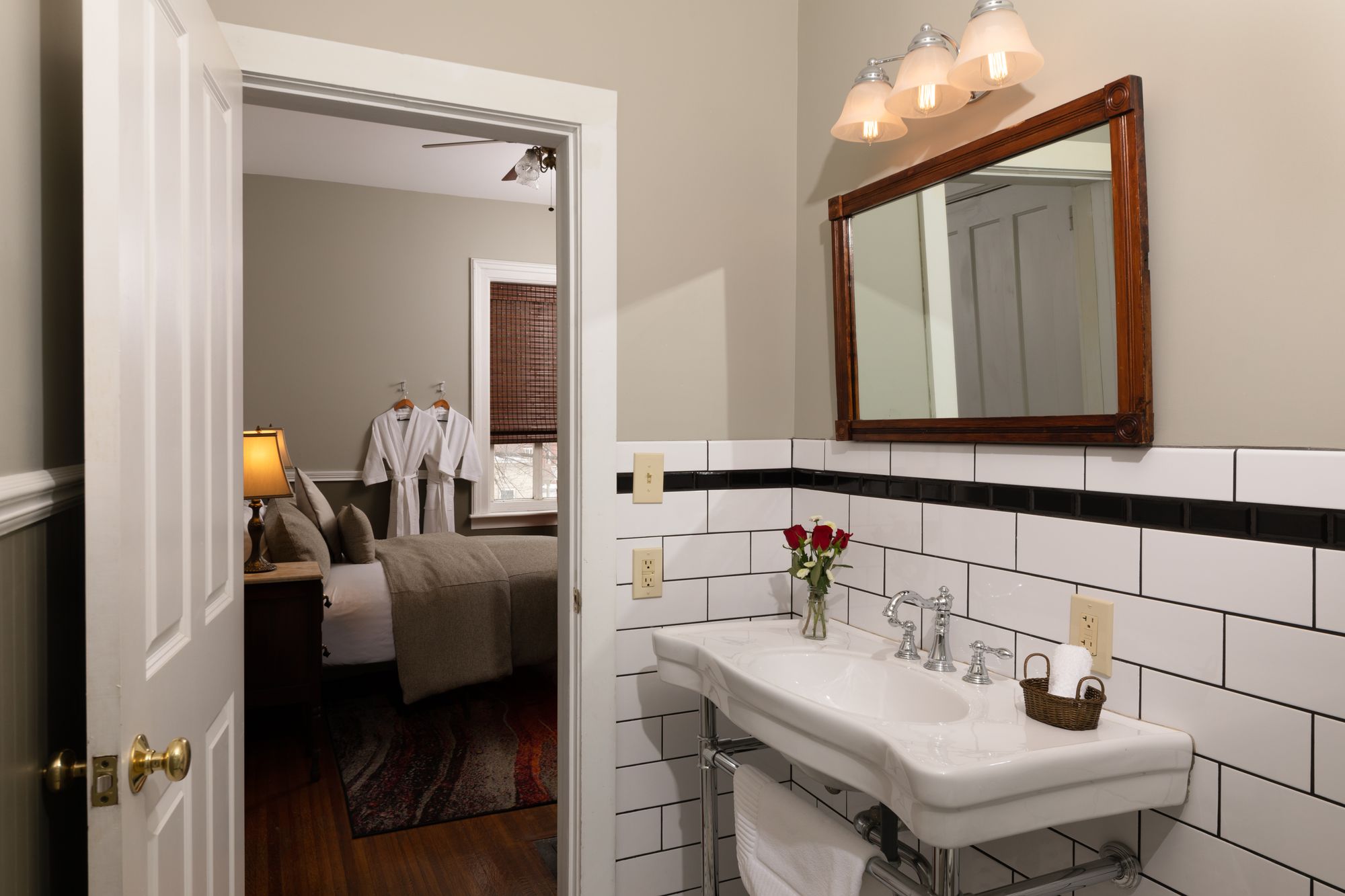 Wine & Roses is popular with our guests for a number of reasons. Looking for first floor comfort? Avoid the stairs in Wine and Roses, our Queen first floor room! In addition to its ease of access, Wine and Roses is one of our best rooms to accommodate you for a longer stay. We have created a private living room space with a couch, coffee table, and TV on one side of the room. The private bathroom is newly updated with a 2-person, custom tiled shower.
