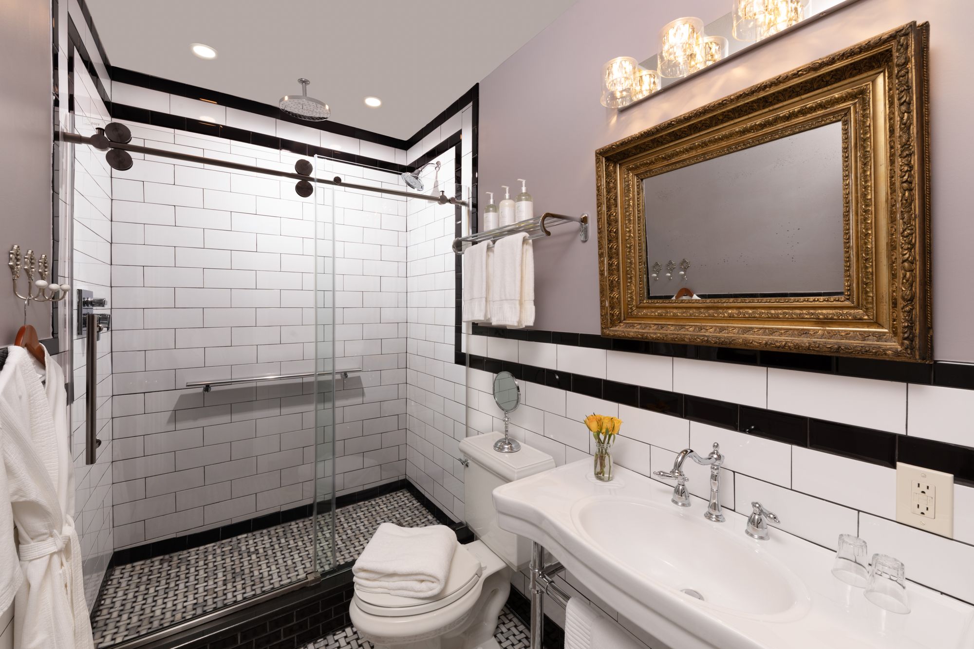 Lavender has a contemporary vibe featuring a fully tiled shower, desk workspace, and electric fireplace to warm the atmosphere